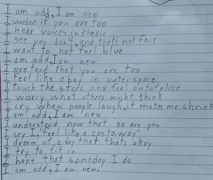 The most moving part of the poem is possibly at the end, where Benjamin describes the feeling of isolation and the longing to be accepted in better terms than most adults could come up with. He writes, “I say, ‘I feel like a castaway.’ I dream of a day that that’s okay. I try to fit in, I hope that someday I do. I am odd, I am new.”