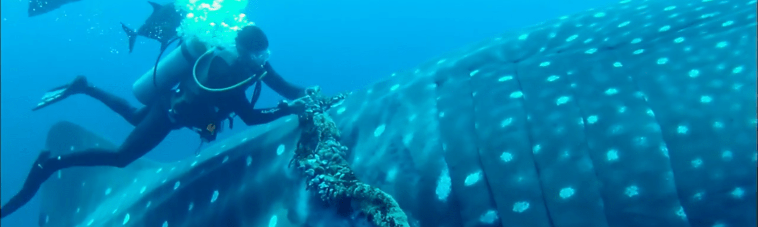 While it is a large, intimidating animal and yes, technically a shark — the whale shark does not attack human beings unless provoked or protecting young. It thus is now a great companion for divers.In this case, it would seem this relationship is not only one-sided.