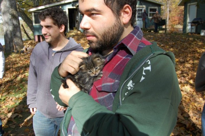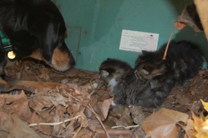 Both kittens were unafraid of the dog as well and approached her like they knew each other. It was clear to the men that the kittens would not survive on their own, so they decided to bring them to the safety of their cabin.