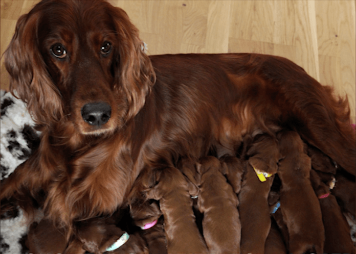 The new Irish Setter mother, Romy, gave birth to a record-breaking litter consisting of 15 healthy puppies. The whole canine pack consisted of 10 females and 5 males which weighed between 275 to 339 grams, approximately 10 ounces to 12 ounces – during the 10-hour labor!