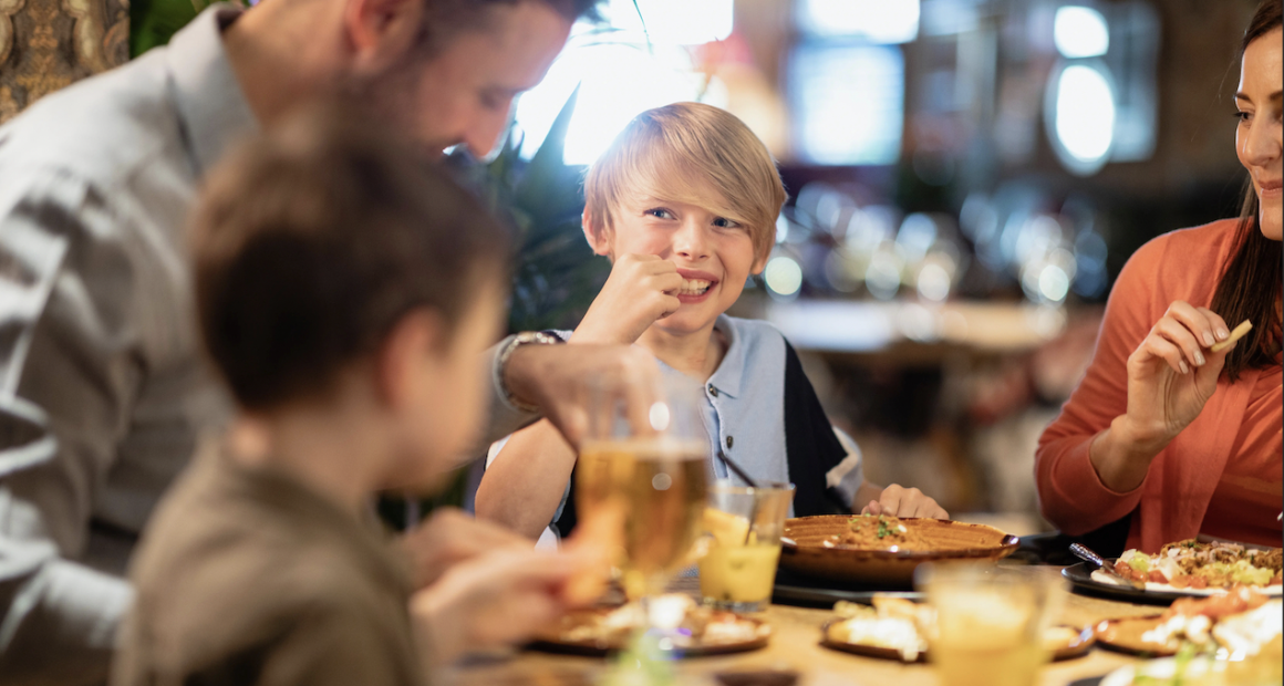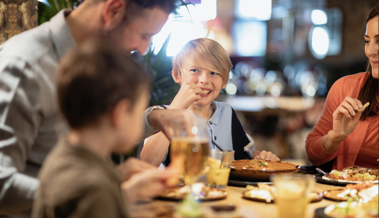 A family eating a meal at a restaurant.