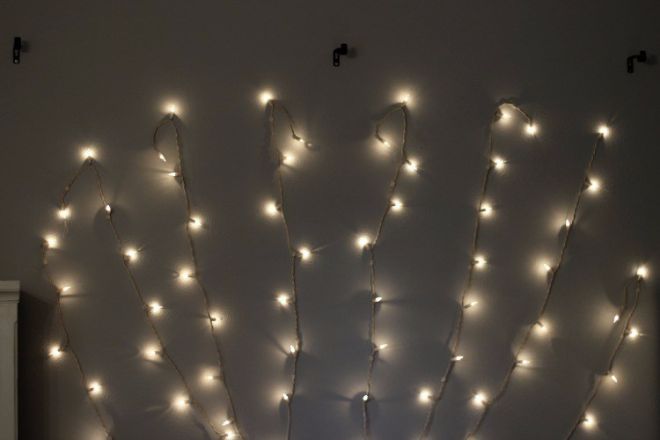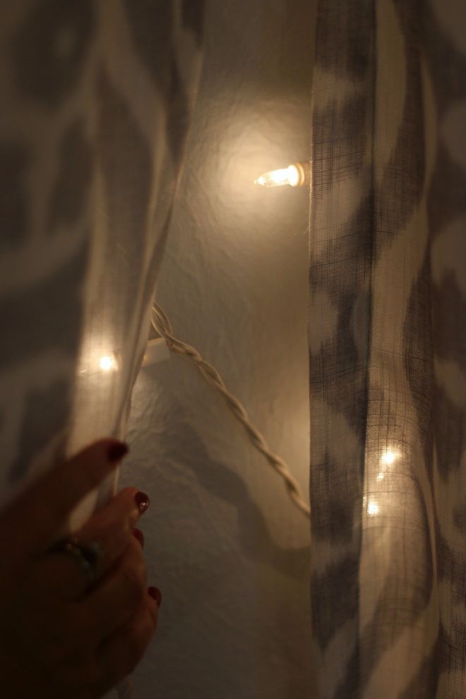 For this setup, put eight nails or tacks about 4 inches below the curtain rod, spacing them at intervals of 8 to 9 inches apart. Now string your lights over the nails or tacks — and don’t puncture the wire. After you plug in the lights and check them, it is curtain time.