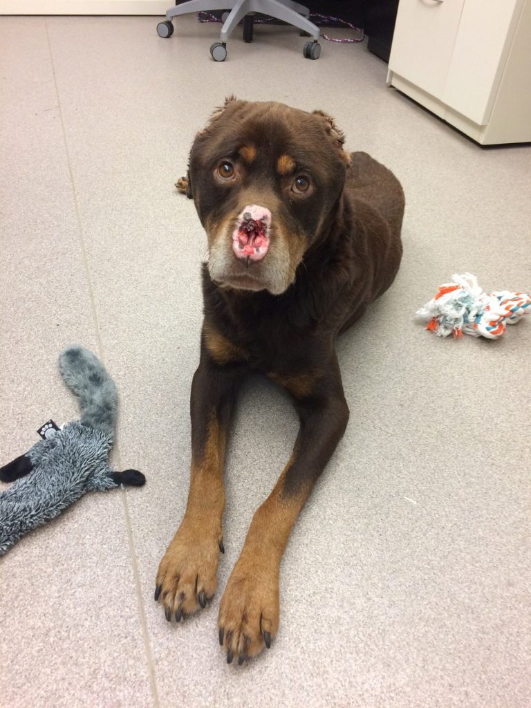 As the vet examined Baron, they immediately determined that someone had brutally cut off the dogs nose and ears, for no apparent reason. The 8-year-old Rottweiler mix also had injuries to his legs and tail.