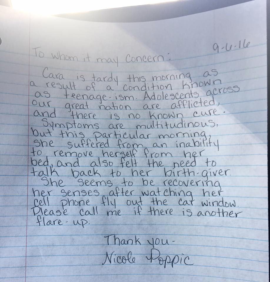 “To whom it may concern, Cara is tardy this morning as a result of a condition known as teenage-ism. Adolescents across our great nation are afflicted, and there is no known cure. Symptoms are multitudinous, but this particular morning, she suffered from an inability to remove herself from her bed. She also felt the need to talk back to her birth-giver! She seems to be recovering her senses after watching her cell phone fly out the car window. Please call me if there is another flare-up.