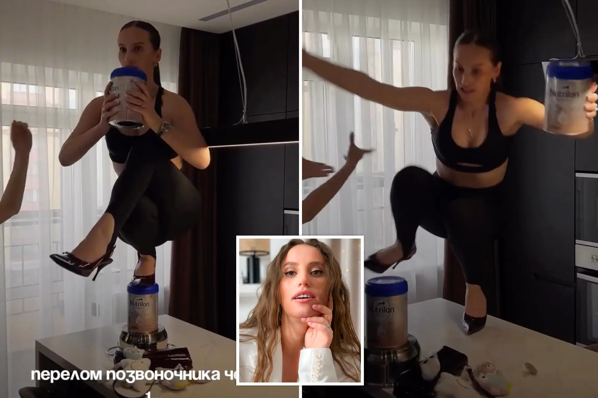 A video shared by Barutkina on Instagram shows her attempting a one-legged squat in high heels — perched on a baby formula container balanced on a sauce pot, which rests on top of a marble kitchen island.