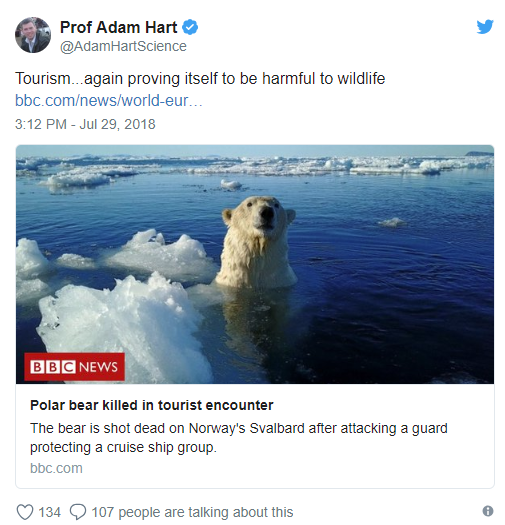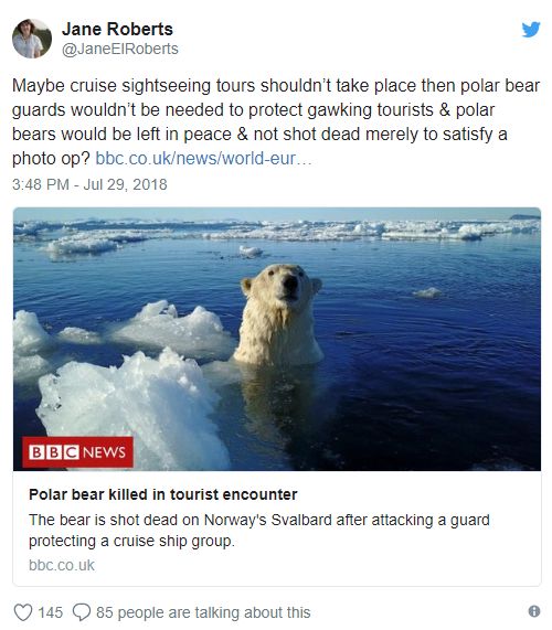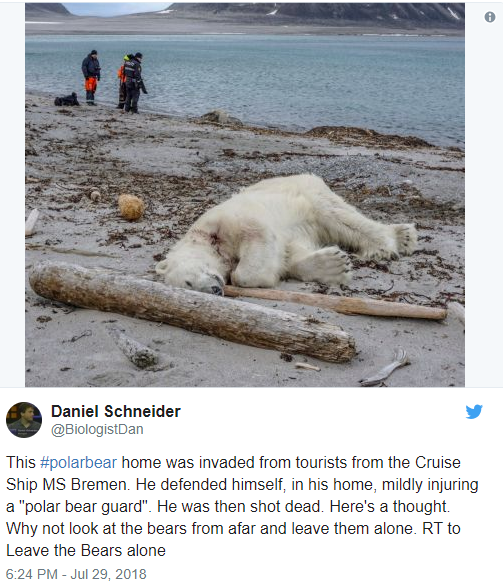 “This #polarbear home was invaded from tourists from the Cruise Ship MS Bremen. He defended himself, in his home, mildly injuring a “polar bear guard”. He was then shot dead. Here’s a thought. Why not look at the bears from afar and leave them alone. RT to Leave the Bears alone.”