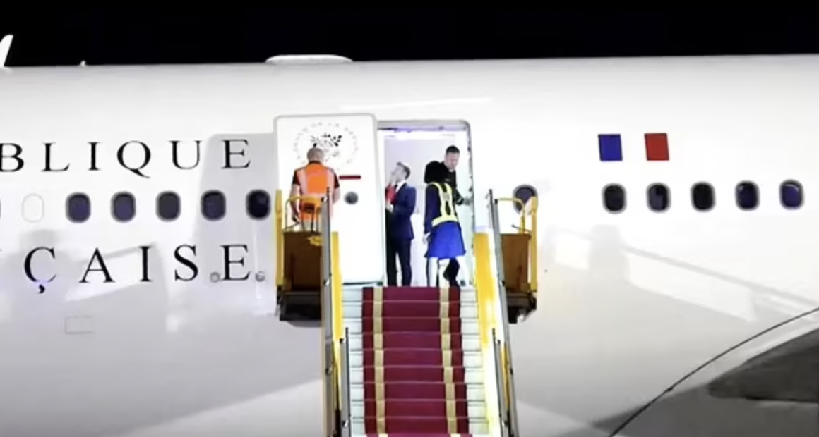 Footage captured by the Associated Press in Hanoi on Sunday evening shows Macron stepping out as the plane door opens.