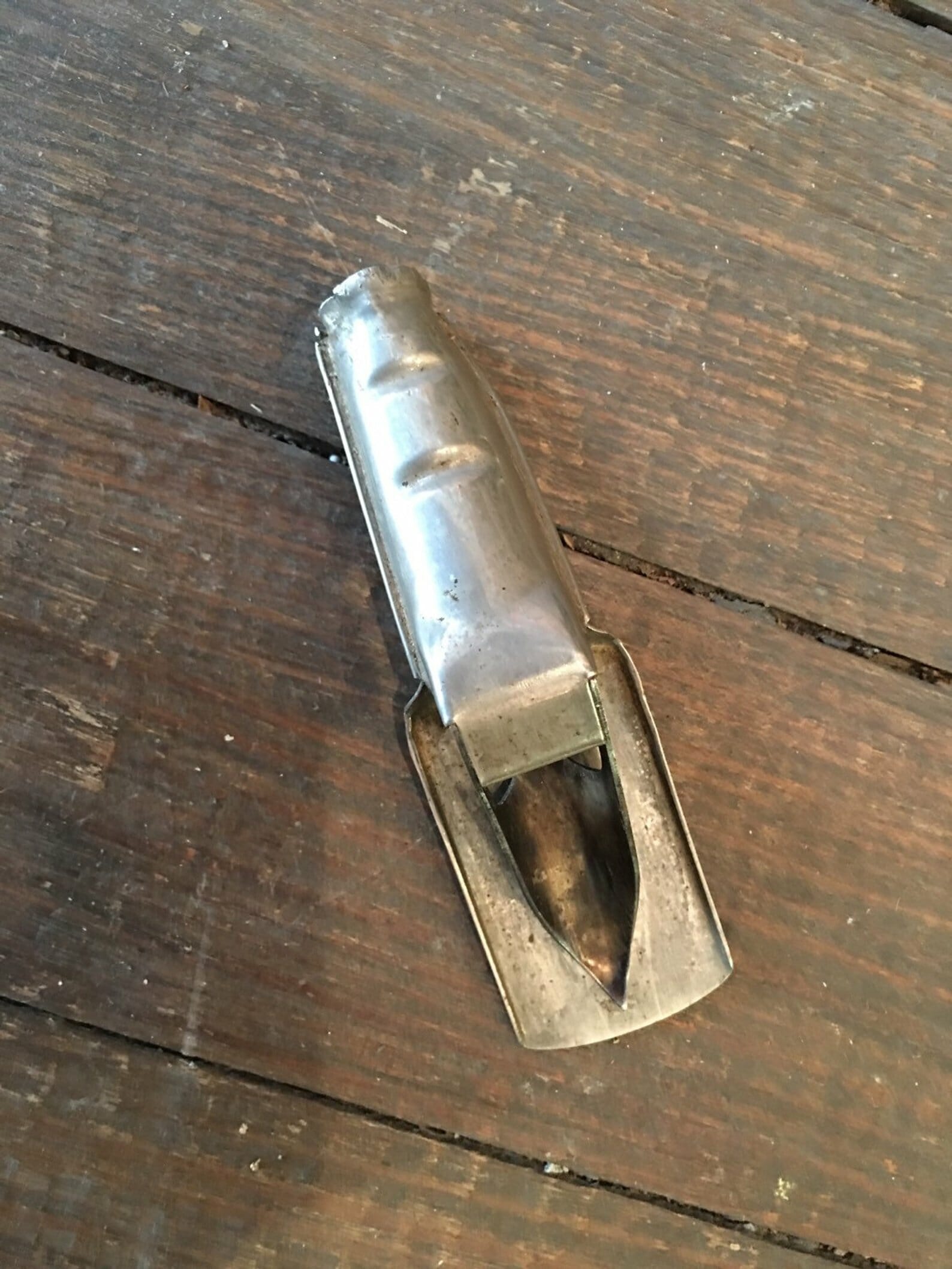 The truth behind this mysterious tool is that it’s a vintage oil can opener spout.